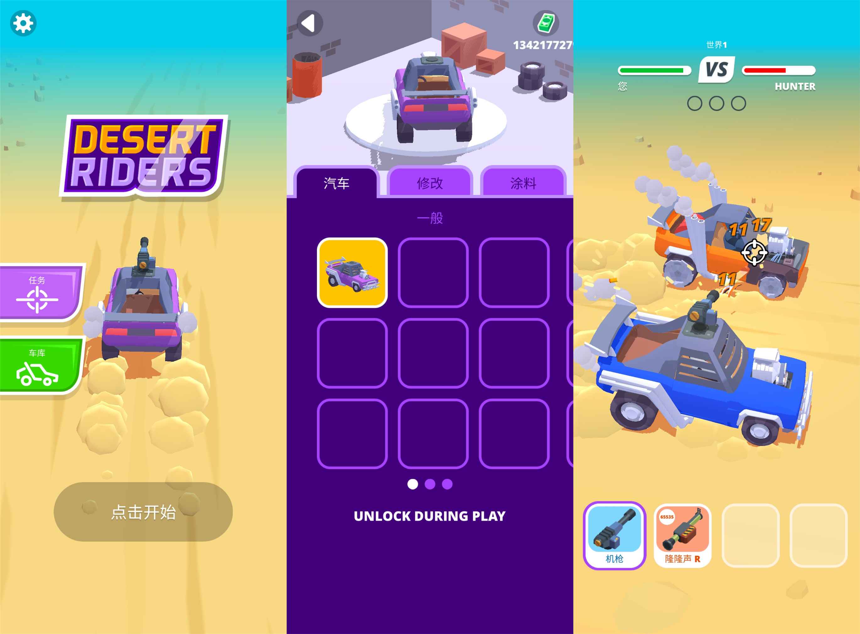 沙漠骑手是一款最酷的射击和驾驶模拟器。改造你的战车,装备精良的武器,击败沿途所有的阻拦者,闯过关卡(大量金钱)